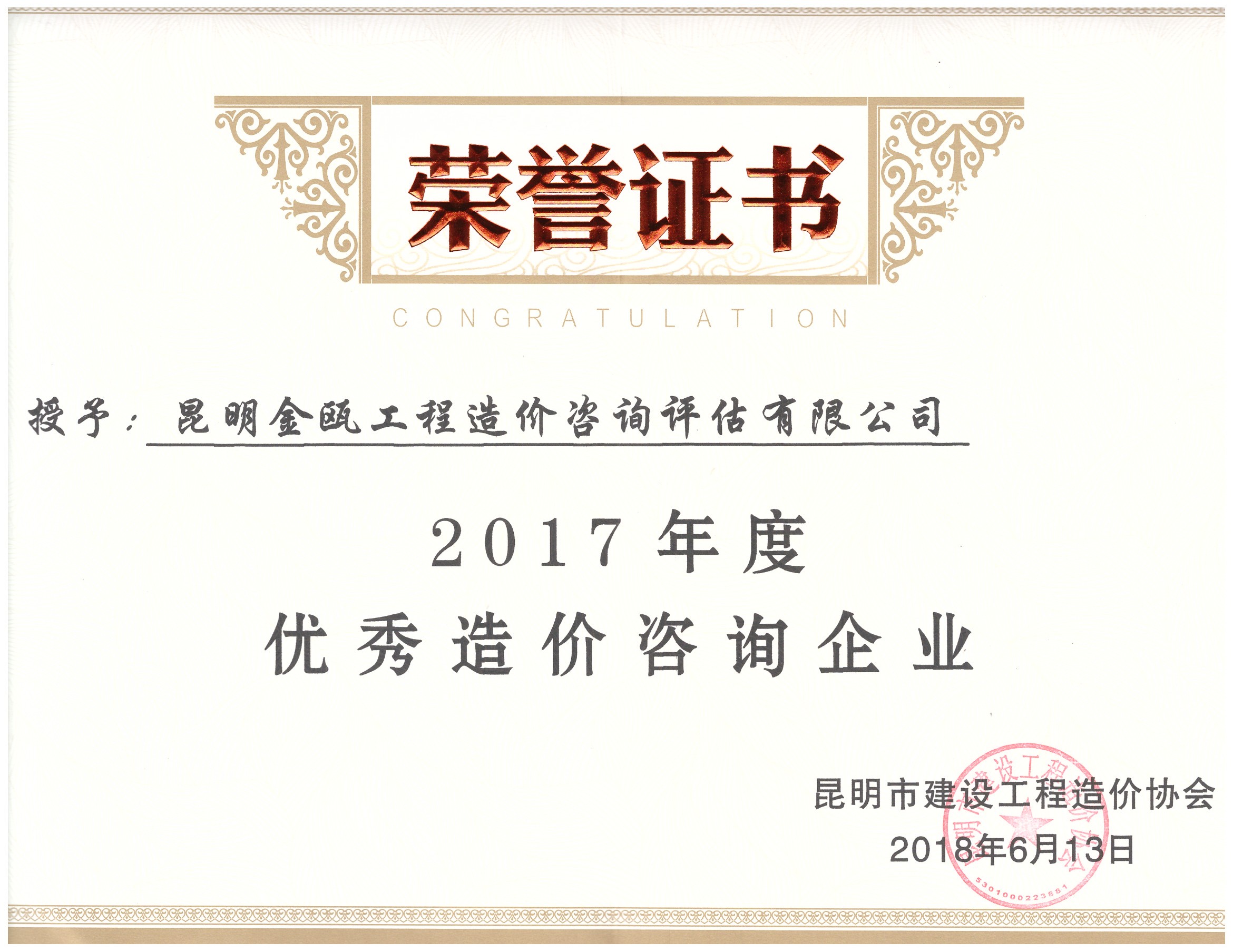 熱烈祝賀昆明金甌工程造價咨詢評估有限公司榮獲昆明市建設工程造價協(xié)會