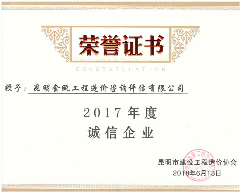 熱烈祝賀昆明金甌工程造價咨詢評估有限公司榮獲昆明市建設工程造價協(xié)會: