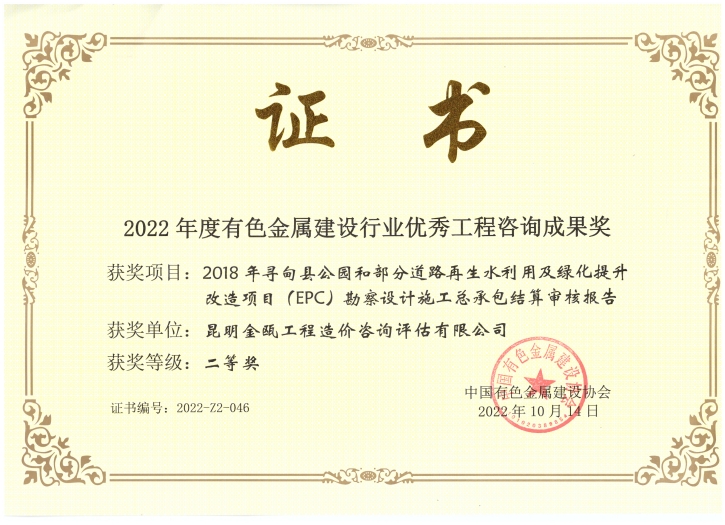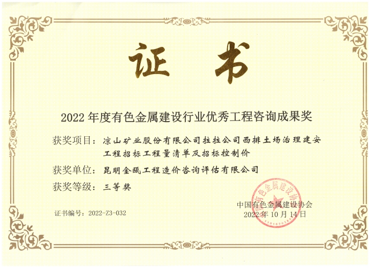 昆明金甌工程管理咨詢有限公司在2022年度有色金屬建設(shè)行業(yè)獲獎情況