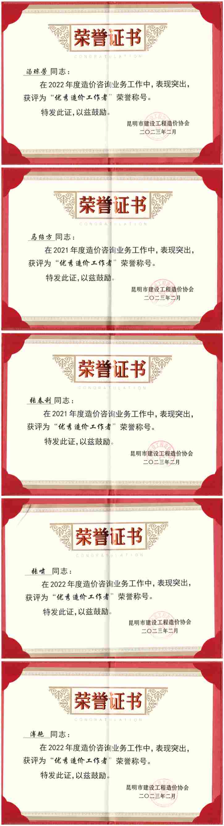 我司優(yōu)秀員工湯瓊芳、馬紹方、張春利、張嘯、溥艷在2021~2022年造價(jià)咨詢業(yè)務(wù)工作中表現(xiàn)突出,榮獲“優(yōu)秀造價(jià)工作者”榮譽(yù)稱號(hào)。